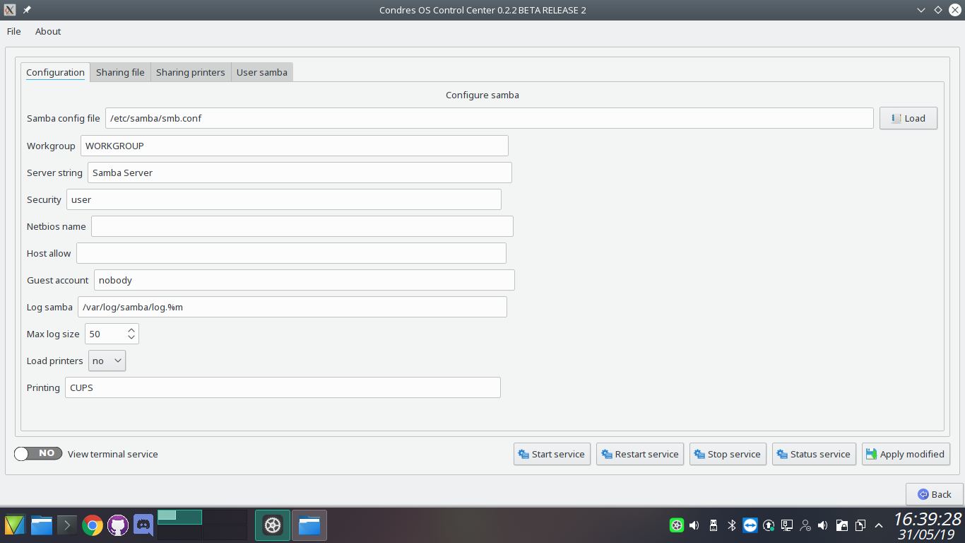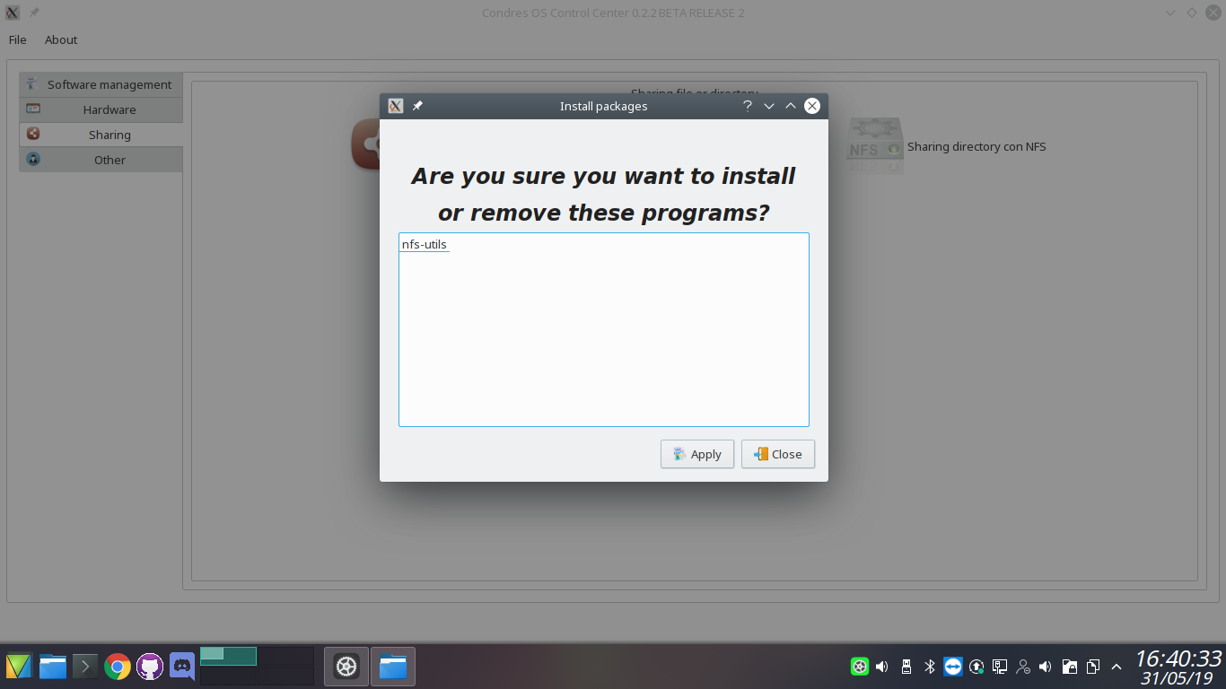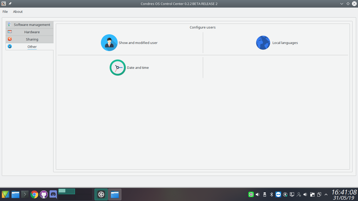 Condres Control Center handles install packages, software update, editor repository, cleaner the cache,view log of installation, keyboard configuration, hardware configuration, sharing samba and nfs, accont user, language, date and time.