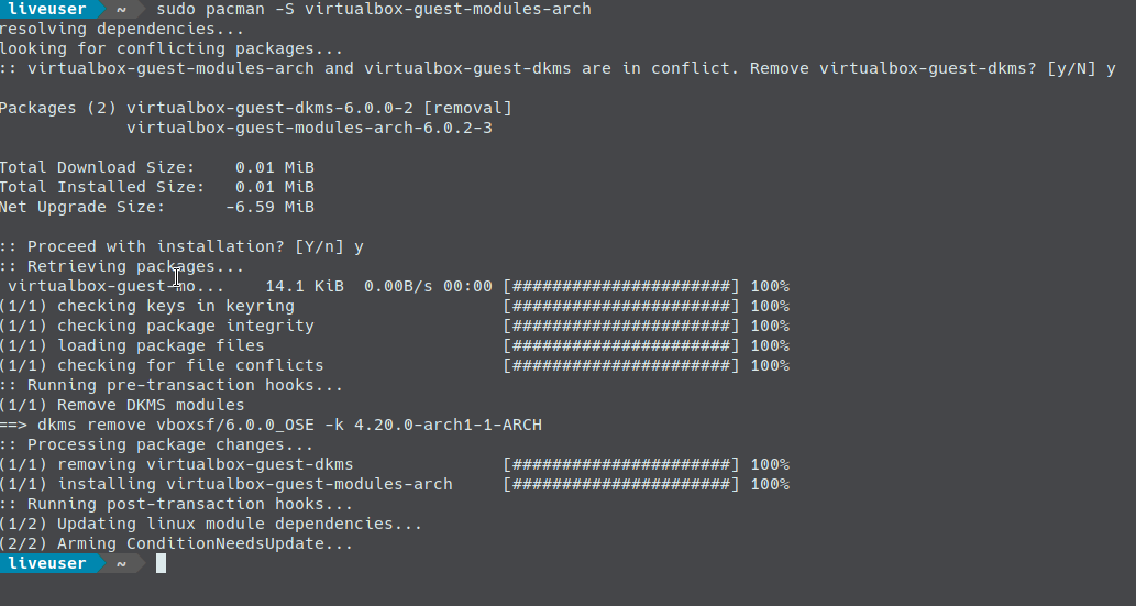 - sudo pacman -Syy sudo pacman -S virtualbox-guest-modules-arch